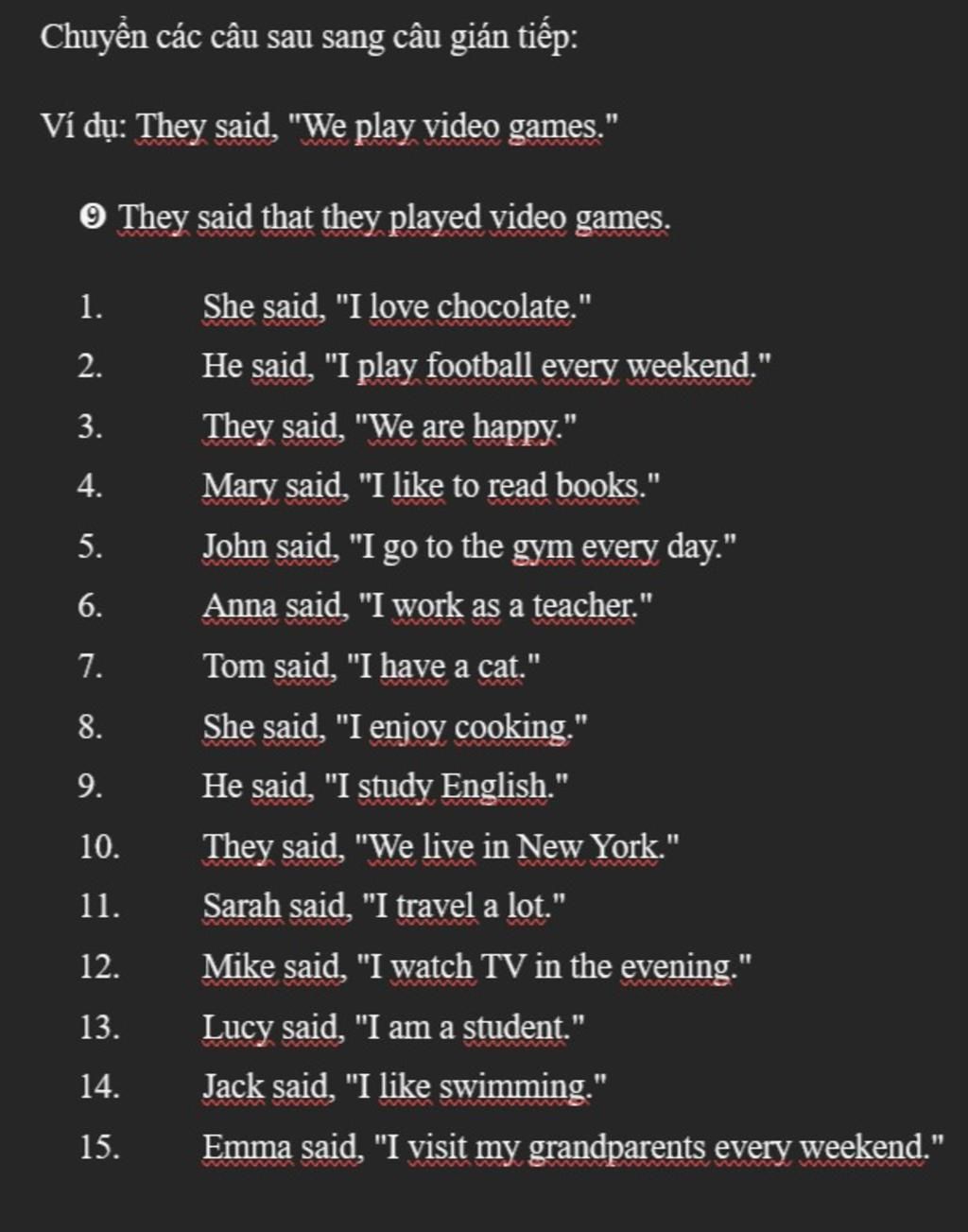 `->` S `+` said to O/told O `+` (that) `+` S `+` V(lùi thì)