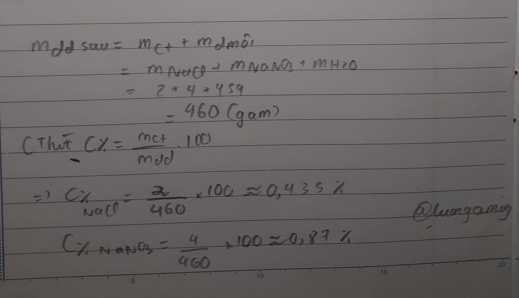 Thêm 2g NaCl và 4g NaNO3 vào 454g nước. Tính C% mỗi chất tan có trong dung dịch thu được sau khi pha