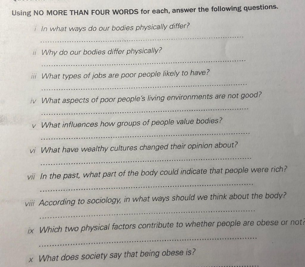 Using NO MORE THAN FOUR WORDS for each, answer the following questions.