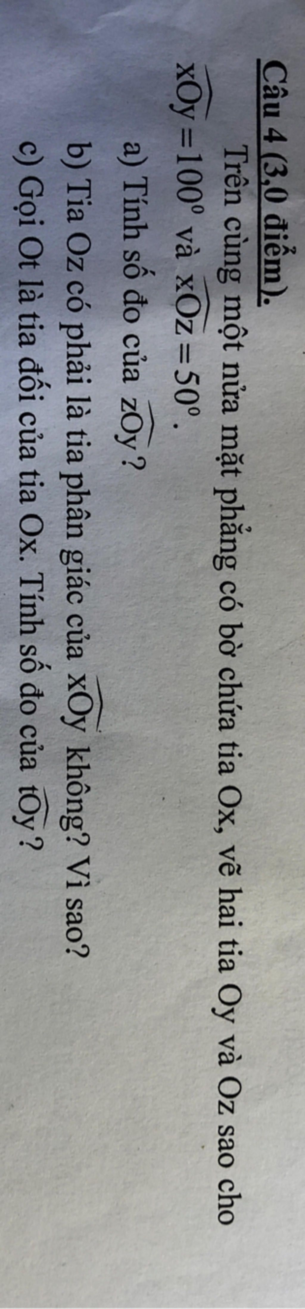 $\text{$\widehat{yOz}$ = $\widehat{xOy}$ − $\widehat{xOz}$ = $100^o$ − $50^o$ = $50^o$}$