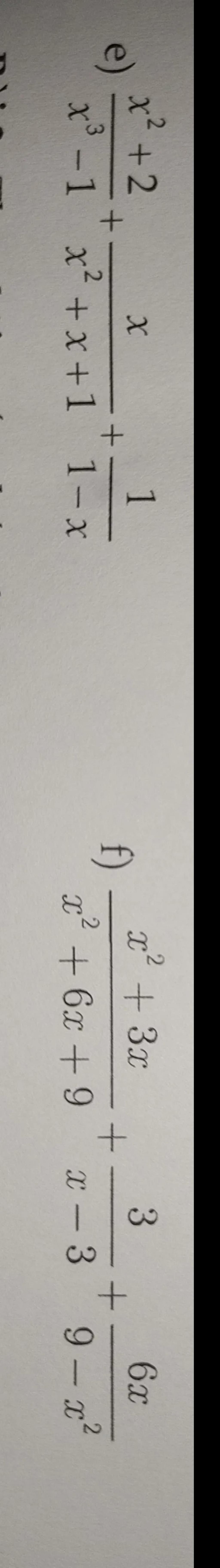 `f) (x^2 +3x)/(x^2 +6x+9) + 3/(x-3) + (6x)/(9-x^2)`