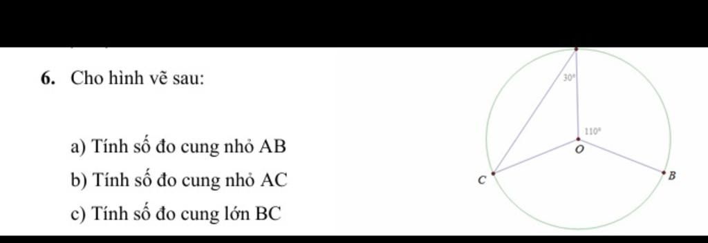 $\mathop{BC_{lớn}}\limits^{\displaystyle\frown} = \mathop{AB_{nhỏ}}\limits^{\displaystyle\frown} + \mathop{AC_{nhỏ}}\limits^{\displaystyle\frown}$ `= 110^o + 120^o = 230^o`