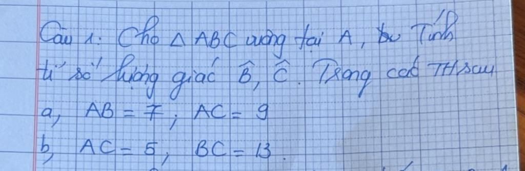 `a)` Áp dụng định lý Pythagore cho `\DeltaABC` vuông tại `A,`ta có: