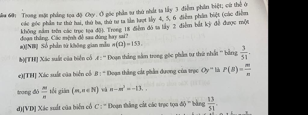 âu 60: Trong mặt phẳng tọa độ Oxy. Ở góc phần tư thứ nhất ta lấy 3 điểm phân biệt; cứ thế ở