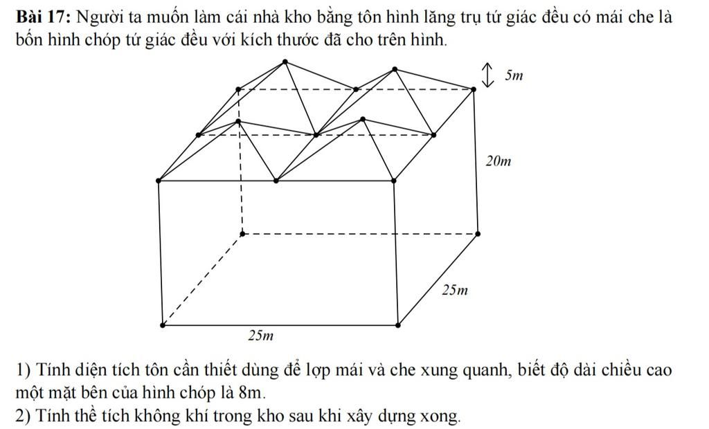 Người ta muốn làm cái nhà kho bằng tôn hình lăng trụ tứ giác đều có mái che là
