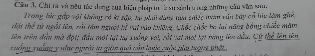 `-` Biện pháp tu từ so sánh trong câu : " Cứ thế lên lên xuống xuống y như người ta giỡn quả cầu hoặc rước pho tượng Phật" là :