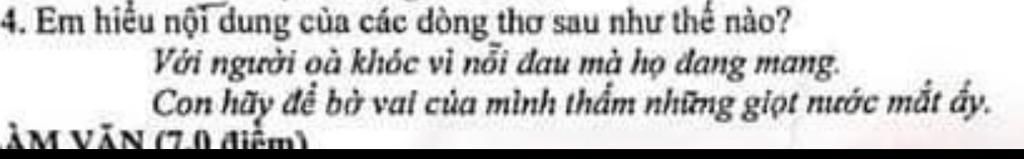 Hai câu thơ trên khuyên nhân vật con hãy luôn sống đồng cảm `,` sẻ chia và quan tâm mọi người `.` Khi trong cuộc sống họ gặp phải hoàn cảnh éo le `,` nổi bất hạnh không đáng có `,` người con hãy trở thành điểm tựa `,` bờ vai để họ có thể an tâm mà khóc `,` vơi đi nổi buồn `,` thấm những giọt nước mắt ấy `.` Đó là thái độ sẵn sàng san sẻ những muộn phiền và âu lo `,` là thái độ đồng cảm `,` quan tâm `,` thấu hiểu `.` Là lòng nhân ái `,` tình yêu thương `-` mối liên kết giữa người với người trong cuộc sống `.`