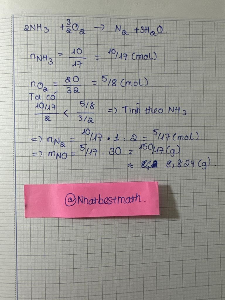 Trong công nghiệp hóa học, nitrogen monoxide là một sản phẩm quan trọng tạo thành từ pư oxi hóa ammonia bởi oxygen. Đây là giai đoạn đầu tiên trong quá trình Ostwald để sản xuất nitric acid. KHối lượng tối đa (gam) nitrogen monoxide thu được là bao nhiêu khi trộn `10` gam ammonia và `20` gam oxygen?