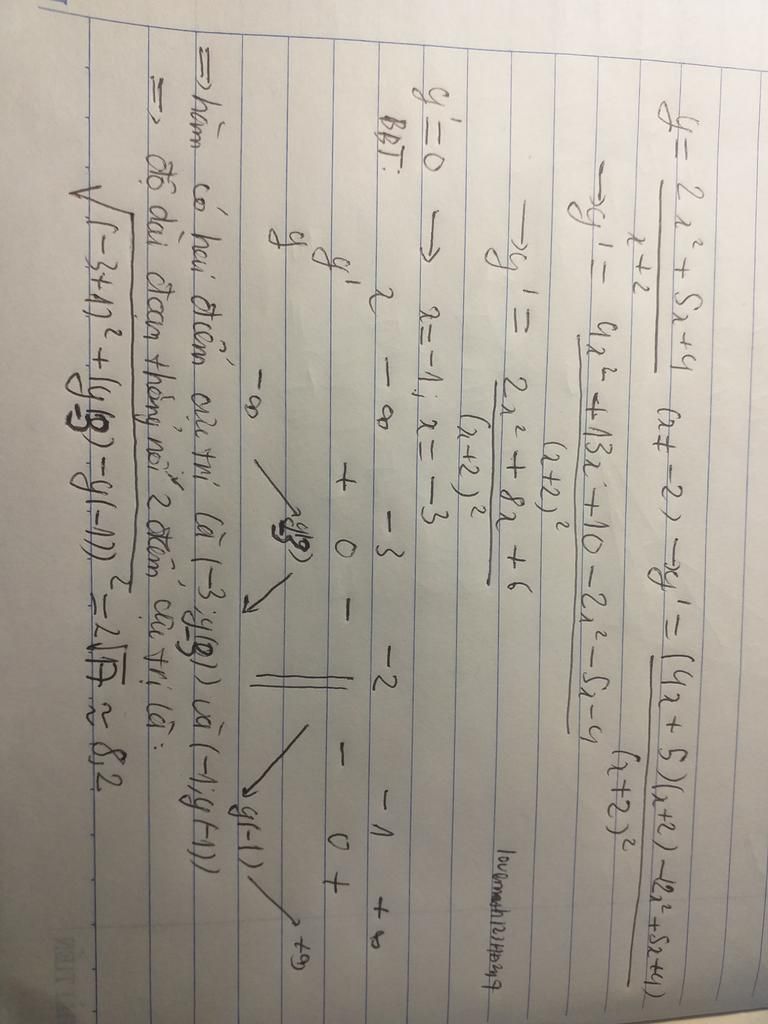 cho hàm số y=2x^2 +5x+4/x+2. độ dài đoạn thẳng nối 2 điểm cực trị của đồ thị hàm số bằng (làm tròn đến hàng phần mười)
