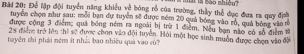 nên học sinh cần ném ít nhất `12` quả vào rổ thì mới được vào đội tuyển