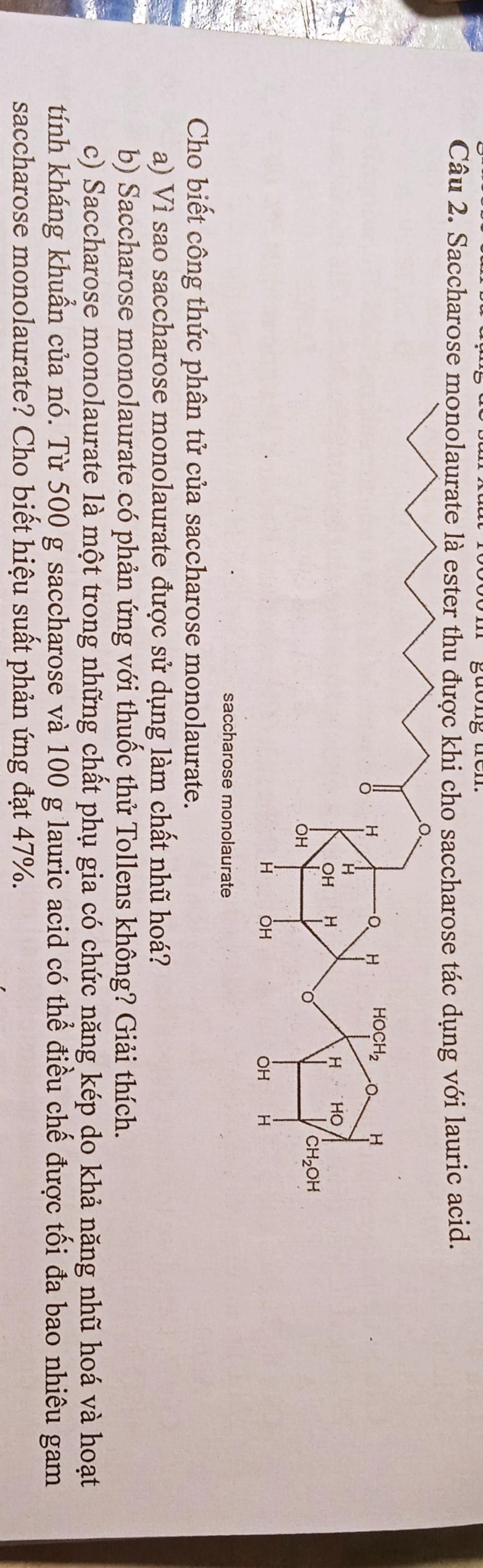 C,saccharose monolaurate là một trong những chất phụ gia có chức năng kép đó khả năng nhũ hoá và hoạt tính kháng khuẩn của nó. Từ 500g saccharose và 100g lauric acid có thể điều chế được tối đa bao nhiêu gam saccharose monolaurate? cho biết hiệu suất phản ứng đạt 47%