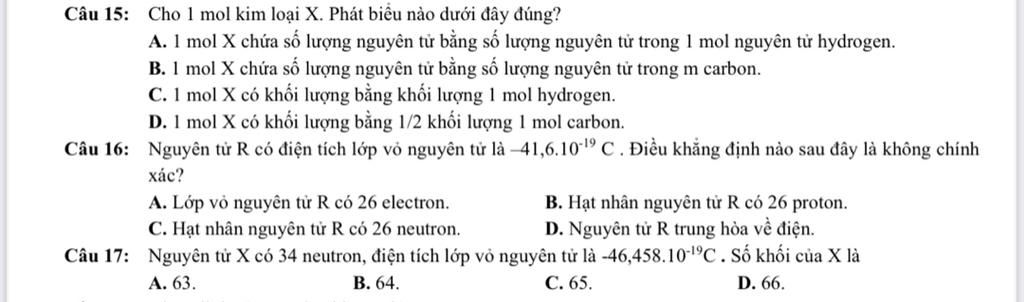 Câu 15: Cho 1 mol kim loại X. Phát biểu nào dưới đây đúng?