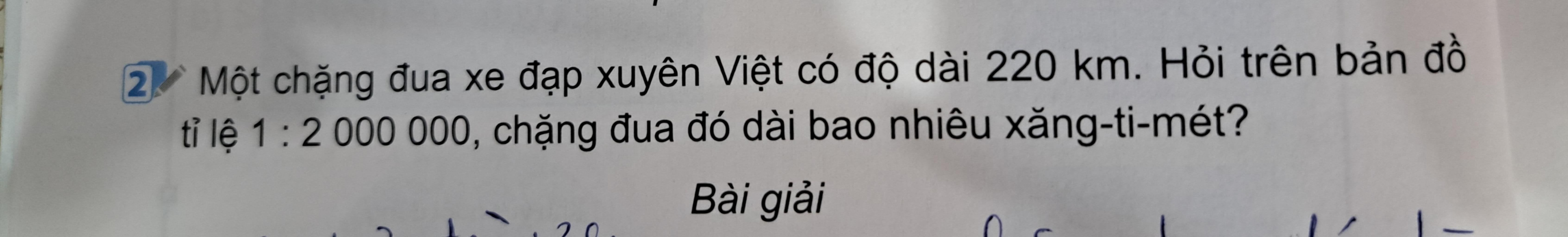 Trên bản đồ tỉ lệ `1:2000000` thì chặng đua đó là số `cm` là: