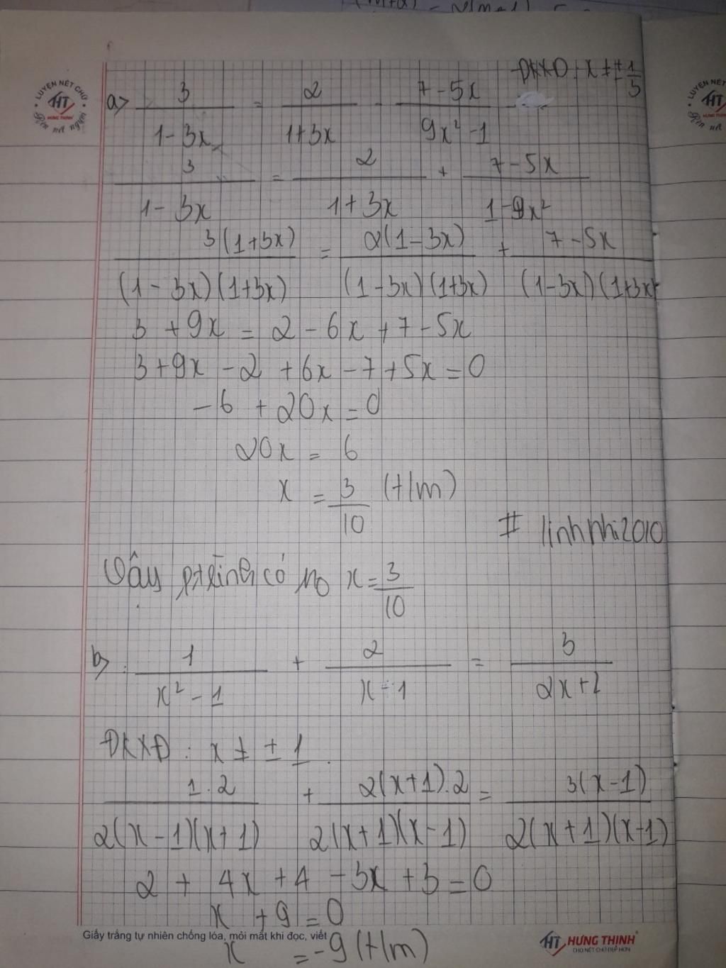 `<=> 3/(1-3x) - 2/(1+3x) - (7-5x)/((1-3x)(1+3x)) =0`