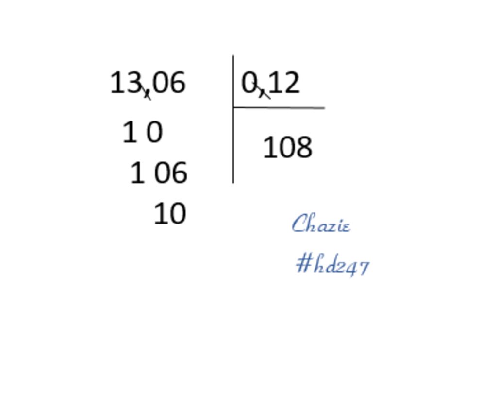 vậy 13,06 : 0,12 = 108 dư 0,1