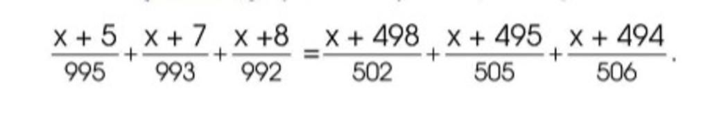 `(x+5)/995+1+(x+7)/993+1+(x+8)/992+1=(x+498)/502+1+(x+495)/505+1+(x+494)/506+1`