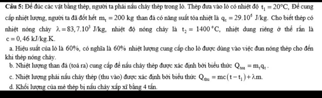 a) Nhiệt lượng có ích cung cấp cho lò được dùng vào việc đun nóng thép cho đến khi thép nóng chảy. Do hiệu suất là 60% là nhiệt lượng có ích là 60% nhiệt lượng toả ra.