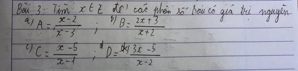 Để `D=(3x-5)/(x-2) in ZZ` thì: