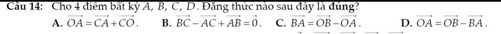 `@` `D.` `\vec{OA}` = `\vec{OB}` - `\vec{BA}`: Đáp án này sai. Theo quy tắc trừ vectơ, ta có: `\vec{OB}` - `\vec{BA}` = `\vec{OA}`.