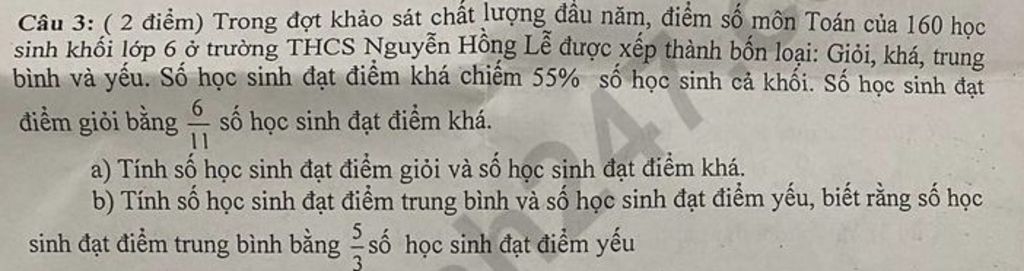 Trong đợt khảo sát chất lượng đầu năm, điểm số môn Toán của 160 học sinh khối lớp 6 ở trường THCS Nguyễn Hồng Lễ được xếp thành bốn loại: Giỏi, khá, trung bình, yếu. Số học sinh đạt điểm khá chiếm 55% số học sinh cả khối. Số học sinh đạt điểm giỏi bằng $\frac{6}{11}$ số học sinh đạt điểm khá.