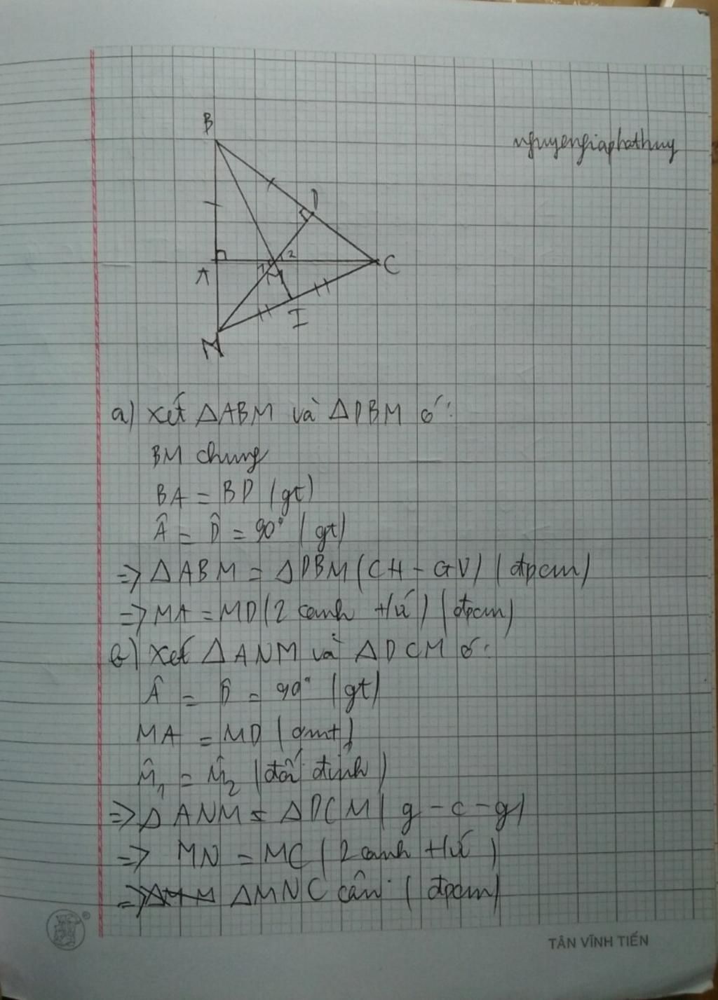 Cho tam giác ABC vuông tại A( AB<AC). Trên cạnh BC lấy D sao cho Bd=DA , đường thẳng vuông góc cới BC tại D cắt AC tại M , cắt tia BA tại M