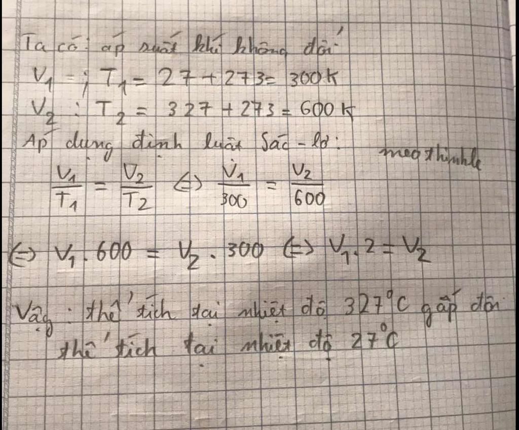 Vậy thể tích của chất khí lý tưởng tại $\rm 327^o C$ là $2V$