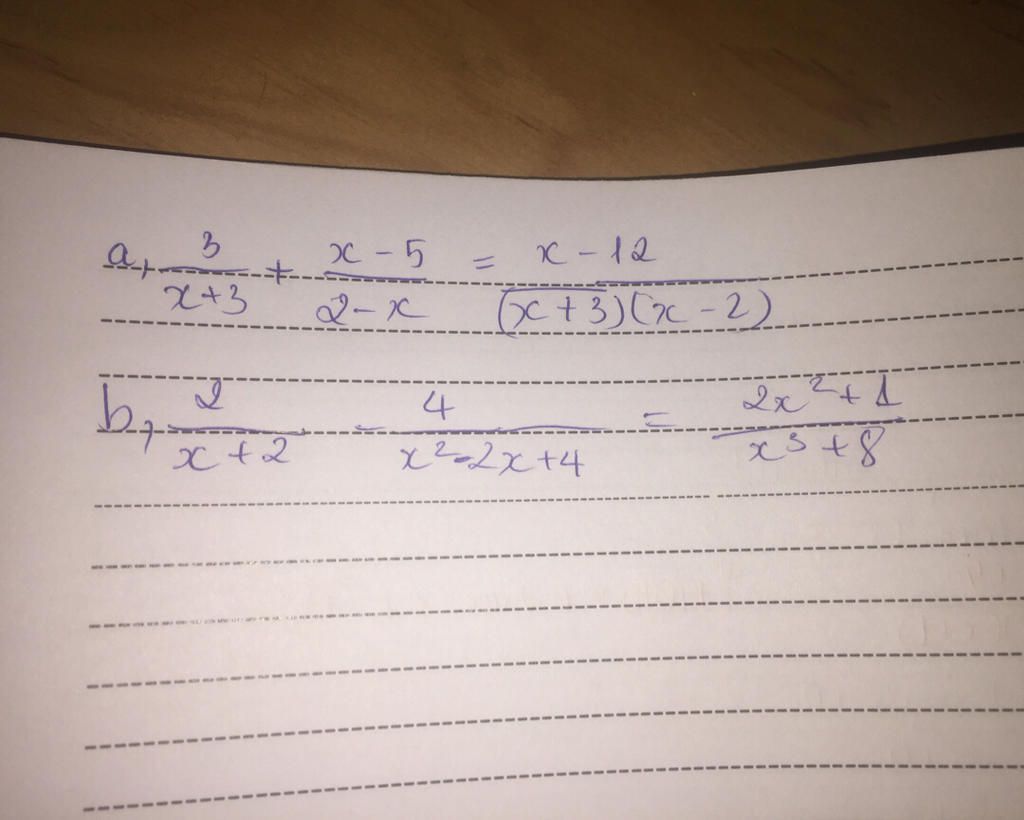 a, $\frac{3}{x+3}$ -$\frac{x-5}{x-2}$ =$\frac{x-12}{(x+3)(x-2)}$