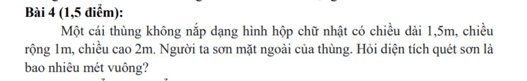 Vậy diện tích cần sơn của thùng là `11,5m^2`