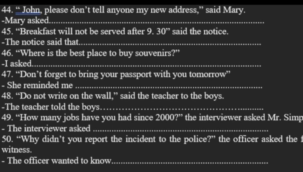 44. Mary asked John not to tell anyone her new address.