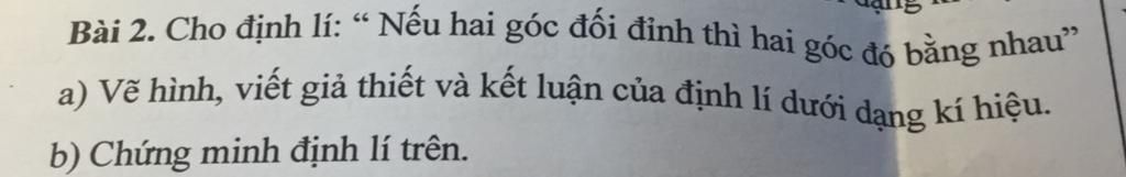 \begin{array}{c|c}\text{GT}&\widehat{xOy}\text{ đối đỉnh }\widehat{x'Oy'}\\\hline \text{KL}&\widehat{xOy}=\widehat{x'Oy'}\\\end{array}