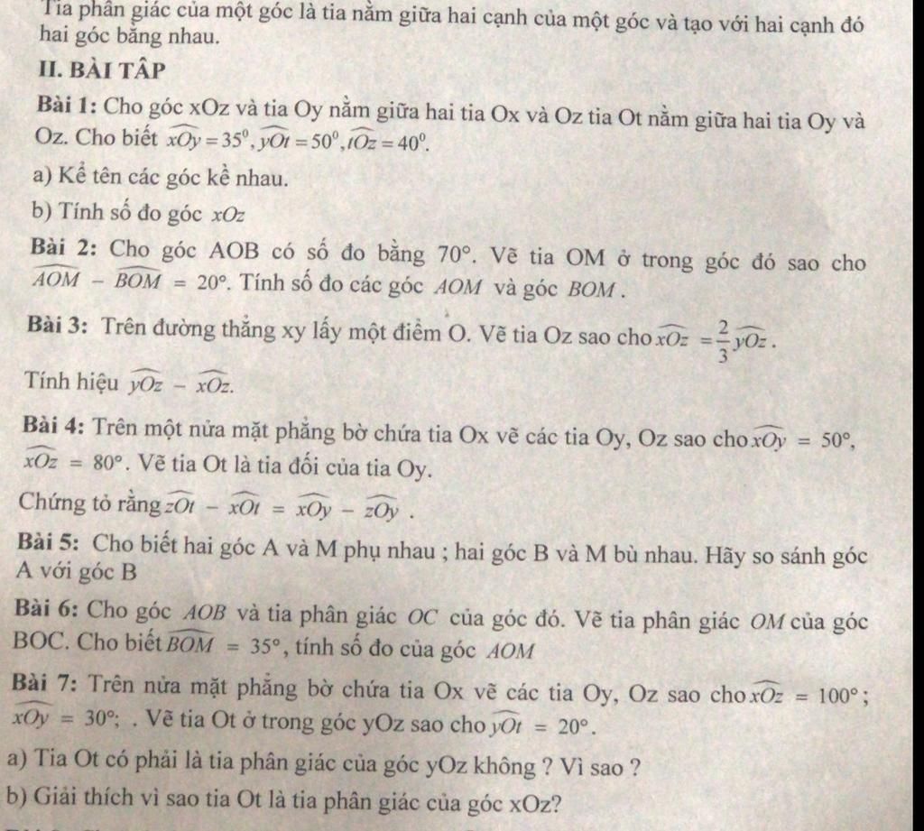Bài 1: Cho góc xOz và tia Oy nằm giữa hai tia Ox và Oz tia Ot nằm giữa hai tia Oy và