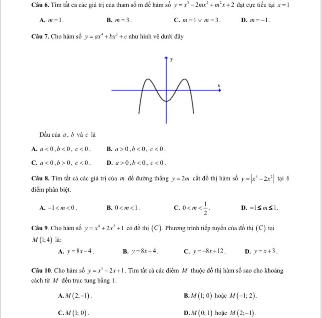 Câu 6. Tìm tất cả các giá trị của tham số m để hàm số y=x − 2mx + m’x + 2 đạt cực tiểu tại x=1
