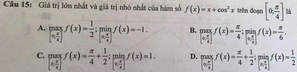 Câu 15: Giá trị lớn nhất và giá trị nhỏ nhất của hàm số f(x)=x+cos’x trên đoạn 0;-