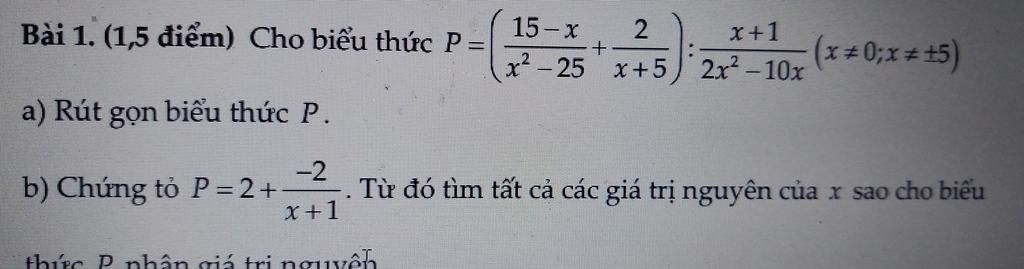 `P = ((15-x)/(x^2 -25) + 2/(x+5)) : (x+1)/(2x^2 -10x) (ĐKXĐ: x\ne {-1;0;+-5})`