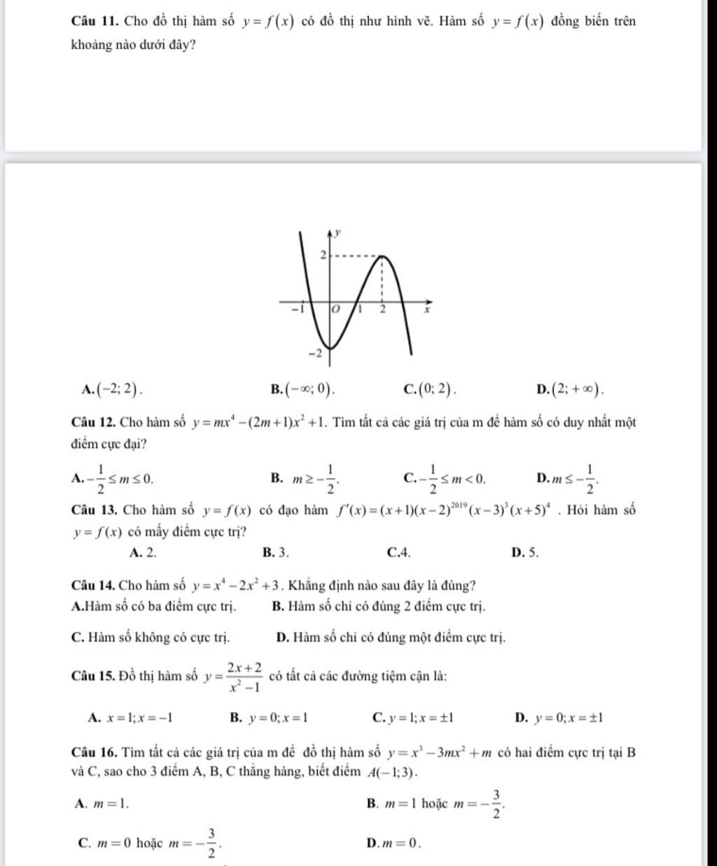 Câu 12. Cho hàm số y=mx* –(2m+1)x^ +1. Tìm tất cả các giá trị của m để hàm số có duy nhất một