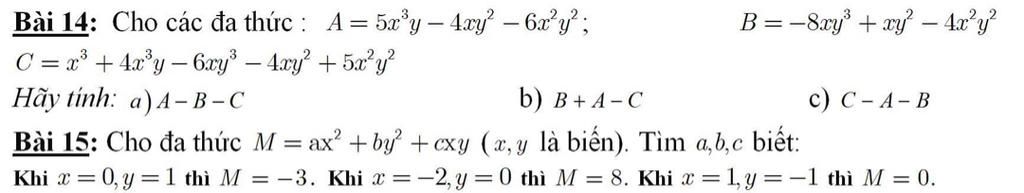 Bài 15: Cho đa thức M = ax + by + cxy (x,y là biến). Tìm a,b,c biết: