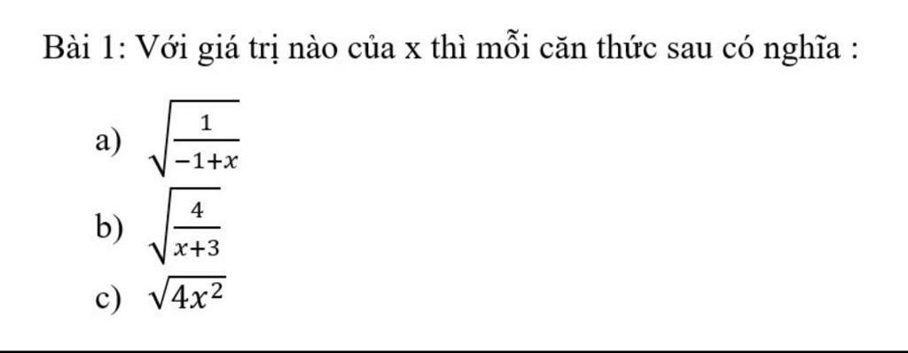 `b)` Để `sqrt(4/(x+3))` có nghĩa thì `4/(x+3)>=0<=>x+3>0<=>x> -3.`