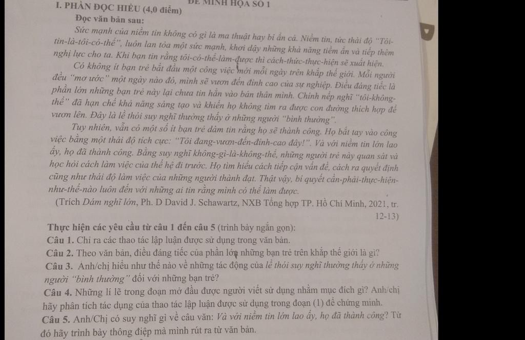 Đoạn 1 sử dụng thao tác lập luận bình luận có tác dụng khẳng định, đưa ra quan điểm về ý nghĩa, tầm quan trọng của niềm tin vào chính mình để đạt được thành công và tiến về phía trước