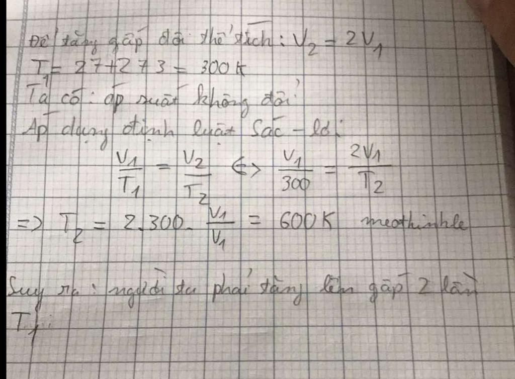 Để tăng gấp đôi thể tích của một khối lượng khí lý tưởng nhất định ở 27 °C và giữ cho áp suất không đổi, người ta phải tăng nhiệt độ lên
