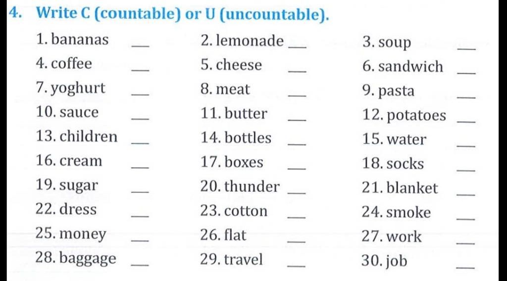 `-` Uncountable : Danh từ không đếm được là những danh từ không đếm được bằng cách số đếm, những danh từ trừu tượng, vô hình.