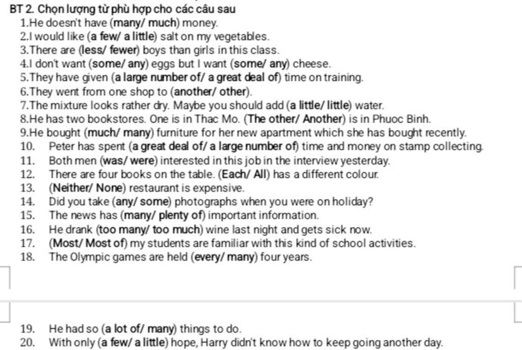 1. much much+ N số ít ko đếm được 2. a little a little + N số ít ko đếm được 3. fewer ss hơn fewer+ N số nhiều + than 4. any/some any dùng trong câu phủ định some dùng trong câu khẳng định 5. a great deal of a great deal of + N ko đếm đc 6. much too much: quá nhiều 7. most of most of+ the + N 8. is too much much+ N số ít ko đếm đc 9.much much+ N số ít ko đếm đc 10. some of some of+ the+ N 11. were both men=> n số nhiều=> to be chia là were 12. Each Each+ V số ít: mỗi 13. The other the other: cái còn lại 14. Neither neither: ko cái nào 15. any any dùng trong câu hỏi 16. plenty of plenty of+ N số ít 17. Neither of Neither of+ the+ N 18. was every+ N+ V chia số ít 19. every every+ N: mọi 20. another