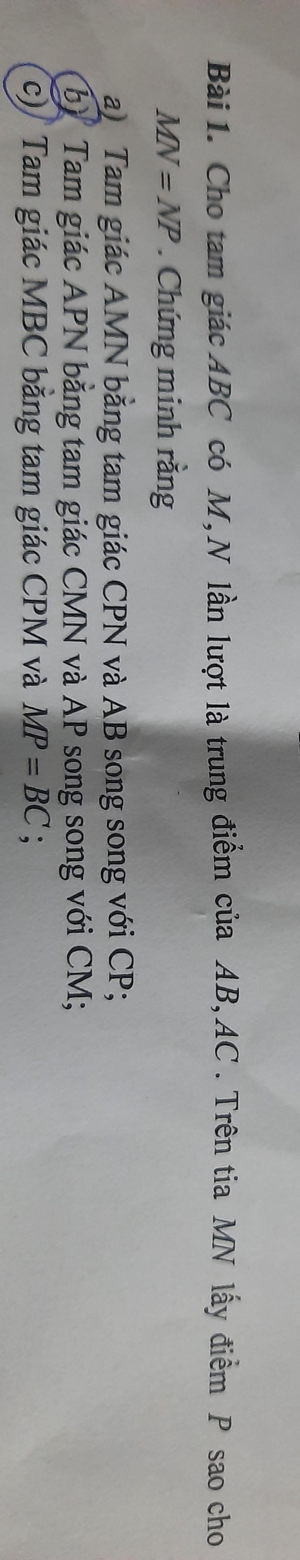 Bài 1. Cho tam giác ABC có M,N lần lượt là trung điểm của AB,AC. Trên tia MN lấy điểm P sao cho