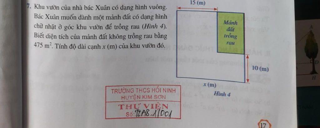475 m2. Tính độ dài cạnh x (m) của khu vườn đó.