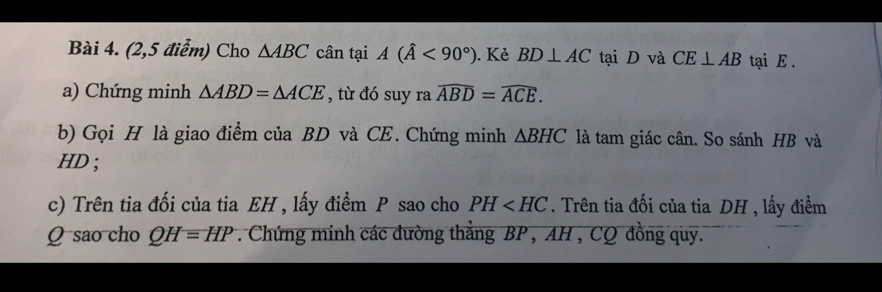 Bài 4. (2,5 điểm) Cho A4BC cân tại A (Â< 90°). Kẻ BD L AC tại D và CE LAB tại E.