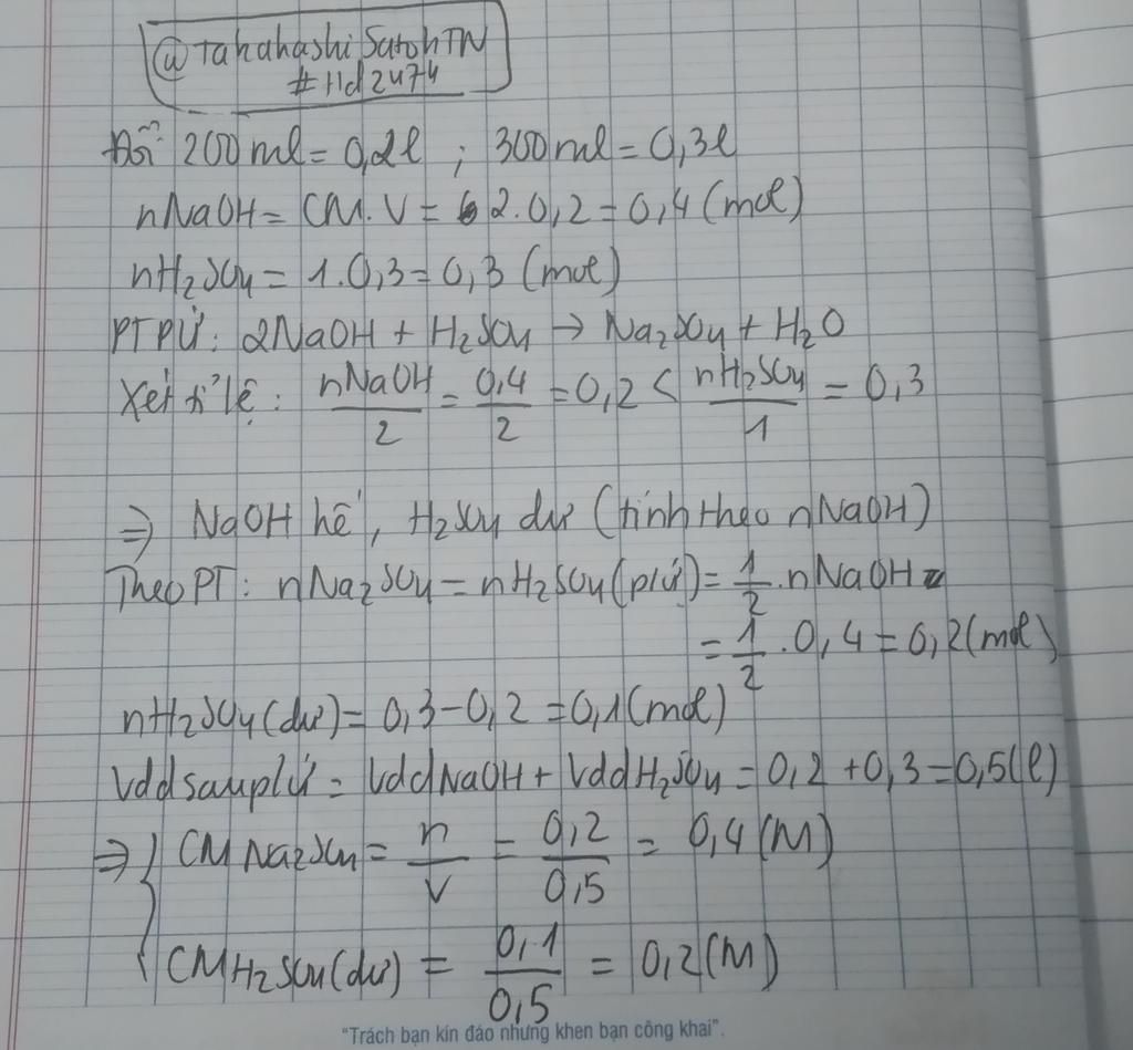 Cho 200 ml dung dịch NaOH 2M vào 300 ml dung dịch H,SO4 1M đến phản ứng hoàn toàn thu được dđX. Tính nồng độ mol các chất có trong dung dịch X.