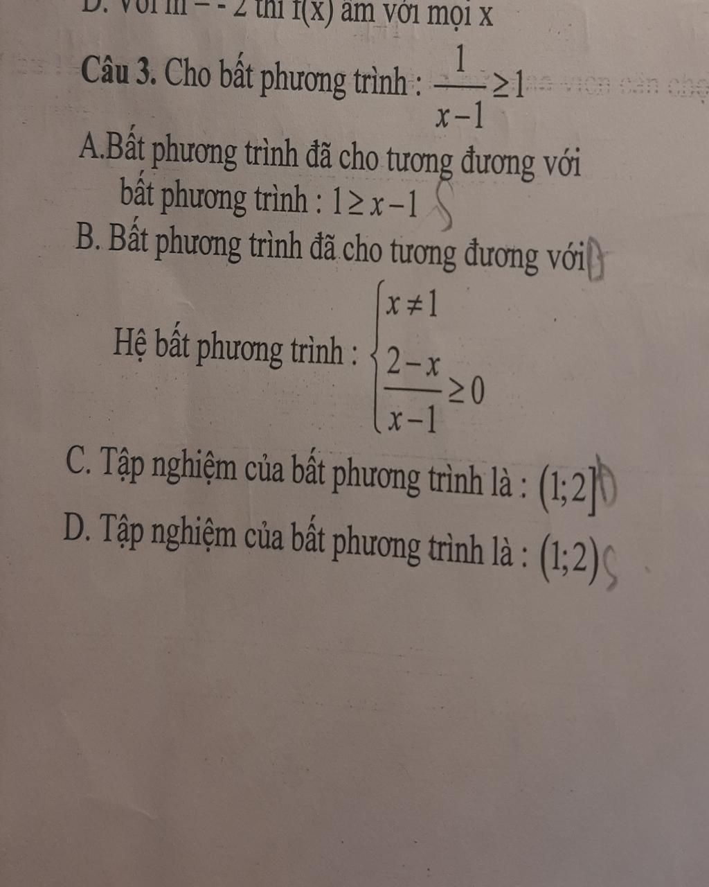 C. Tập nghiệm của bất phương trình là : (1;2)