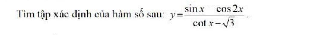 TXĐ : `cotx - sqrt3 \ne 0 <=> x \ne (\pi)/6 + k\pi (k \in ZZ)`
