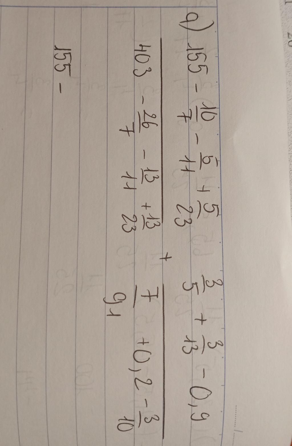 `(155-10/7 - 5/11 + 5/23)/(403-26/7-13/11+13/23) +(3/5+3/13-0,9)/(7/91+0,2-3/10)`