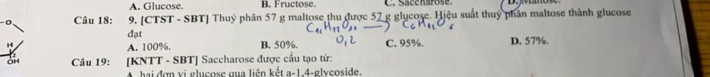 Câu 18: CTST - SBT) Thuỷ phân 57 g maltose thu được 57g gluco Hiệu suất thuỷ phần maltose thành glucose