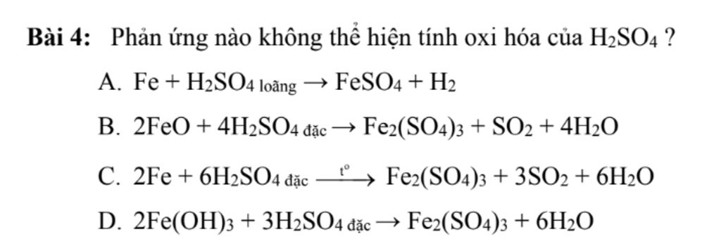Riêng câu D, hidro vẫn giữ +1, S vẫn giữ +6, không hề giảm (tính oxi hóa) hay tăng gì cả. Đây còn không phải là phản ứng oxi hóa - khử nữa mà!